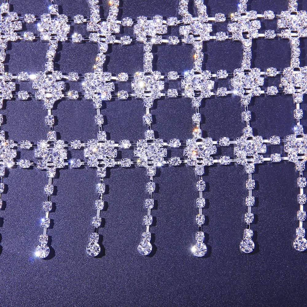 The Chat Noir Halter Fringe Top is a bold and stylish body jewelry piece designed to enhance your look with crystal shine and modern edge. Crafted with high-quality rhinestones and a durable zinc alloy base, this halter-style bra chain features a geometric design with claw-set crystals for long-lasting sparkle. A striking balance of glamour and comfort.